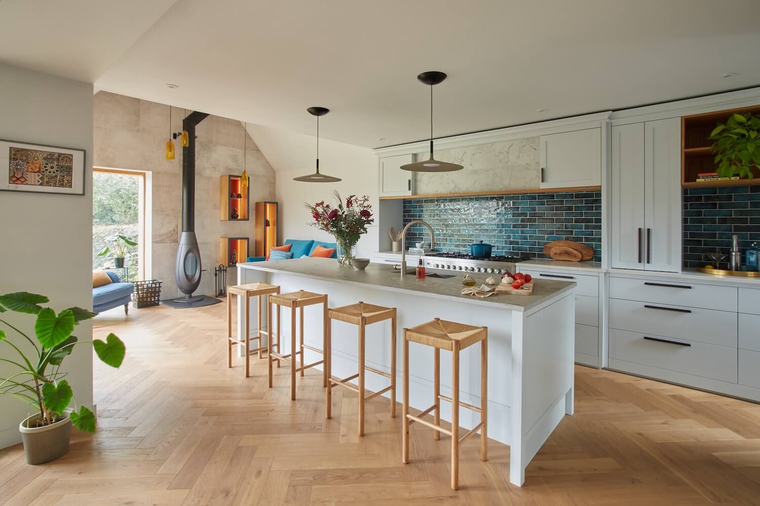 The only design request from the clients was for Shaker-style cabinetry. Having spent time speaking to them and viewing the architect’s drawings and visuals, I decided to opt for a more contemporary version of this classic style. The choice of colour and materials were all driven by wanting to bring lots of texture and vibrancy to the space, while still maintaining a sense of calm and serenity. The space has three distinct areas – the kitchen, the dining area and living space.