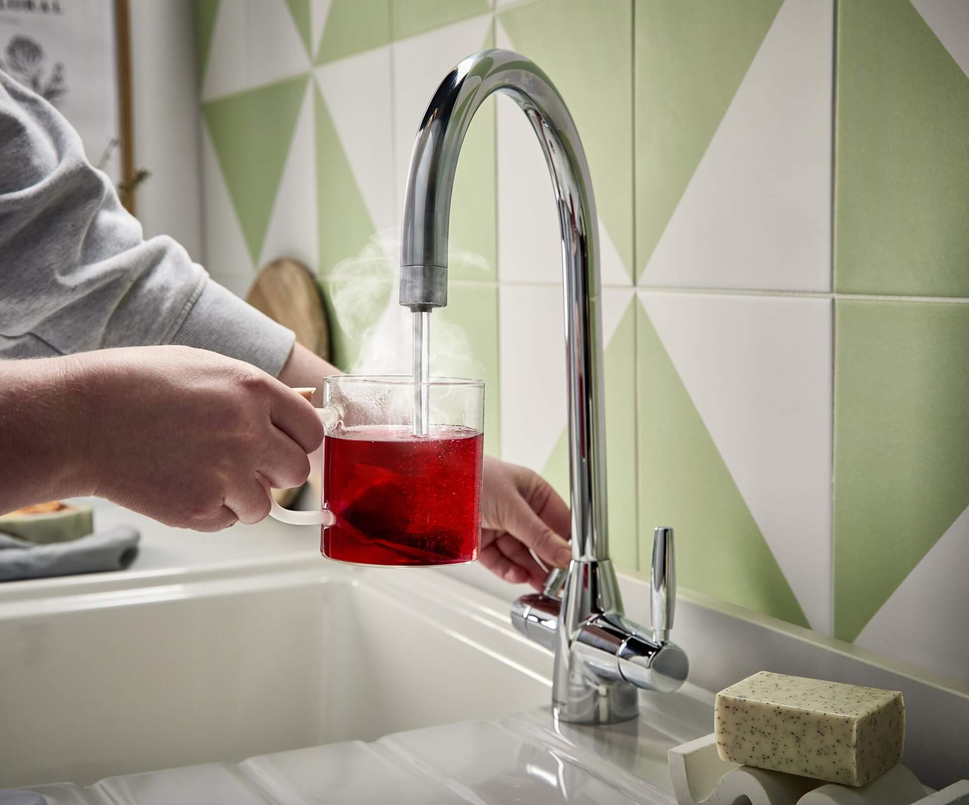 Abode also presented a new relaunch of their boiling water tap collection, using advanced boiler technology. This is the new Persona boiling water tap featuring fluted dual lever handles. It will pair with the Optima Belfast Sink which features a fluted front.