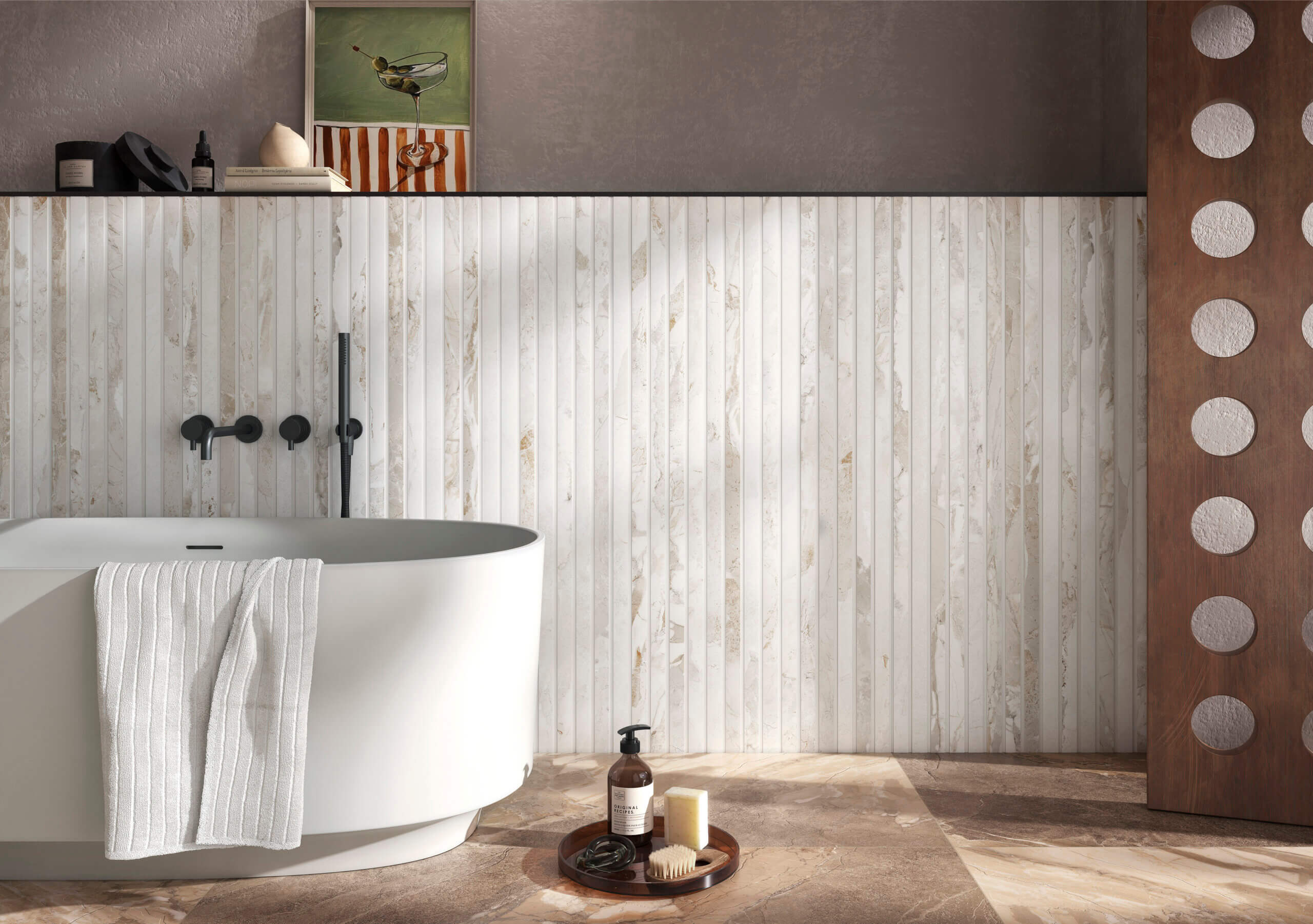 Stokes Tiles took the opportunity to show interesting new arrivals, including Blend, which is available as large format plain tiles, 600mm x 600mm and also, as shown here, Milled Décor tiles, with a ribbed surface pattern, designe