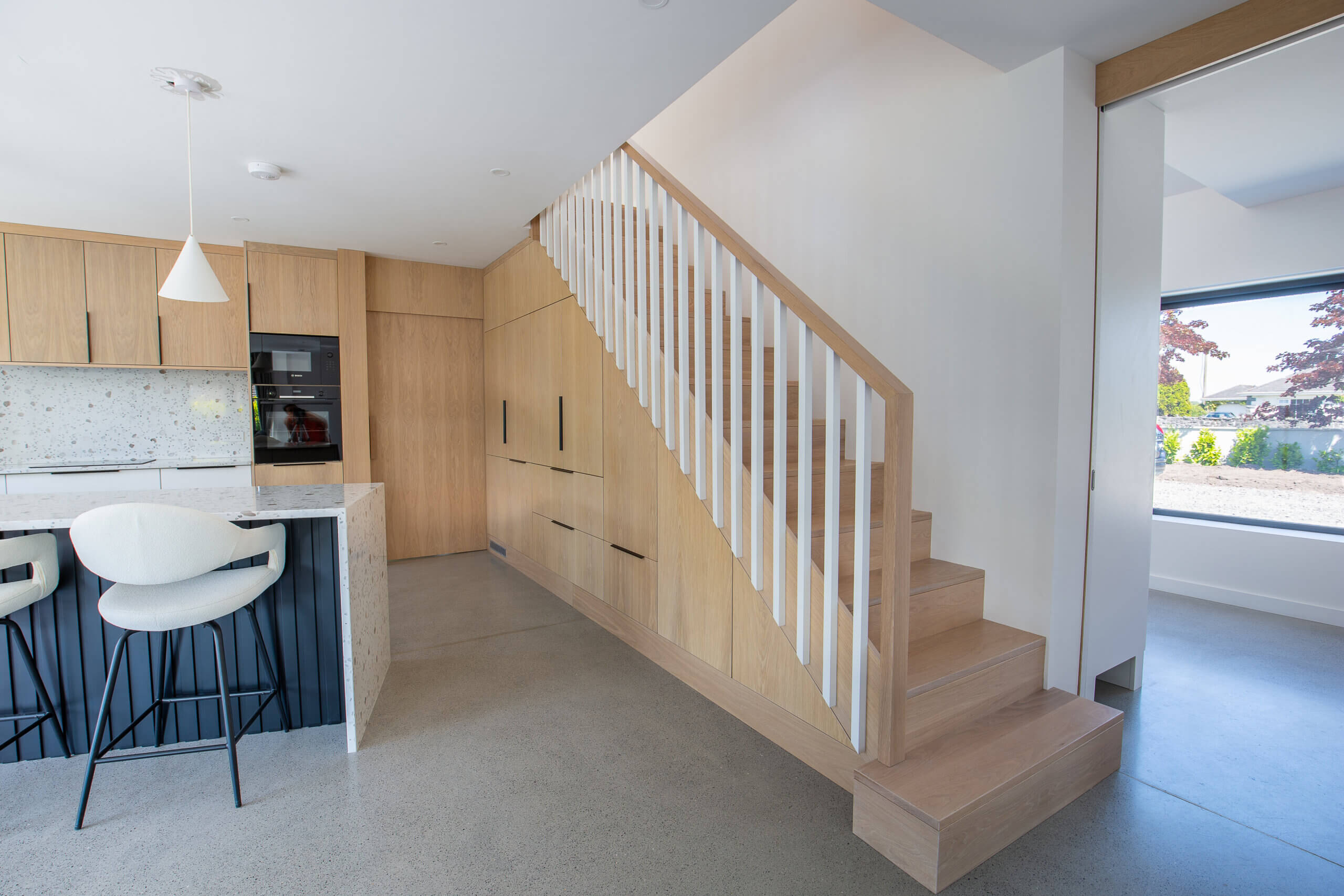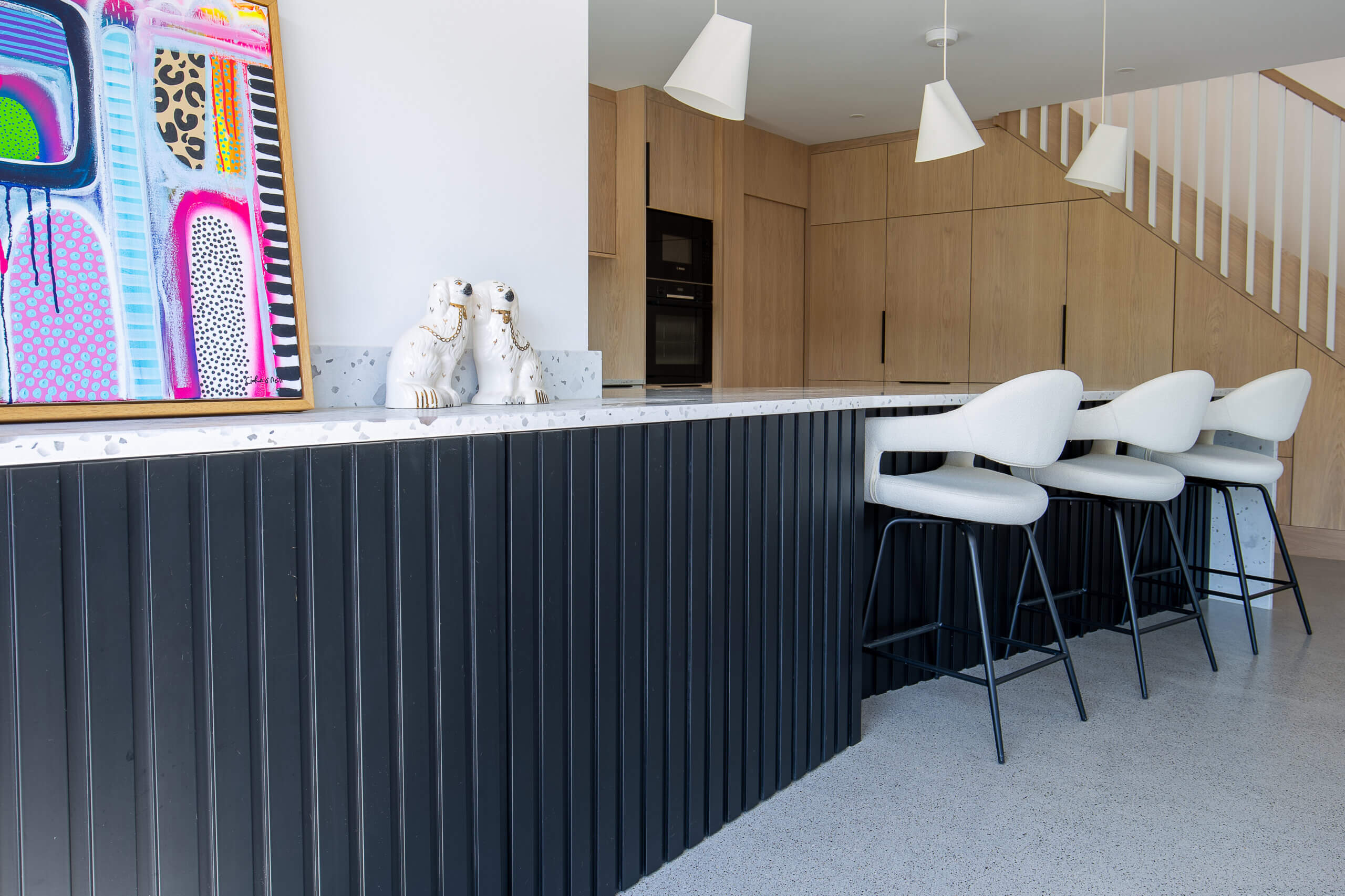 We kept the wall colour very neutral, allowing the kitchen to sit into the space and give the client a plain background for her art and accessories to shine. To maximise the amount of storage, we used the space under the stairs for cabinetry. This area includes a breakfast pantry, a larder fridge and lots of storage. As the kitchen is open to the living and dining areas, we created subtle divides throughout to define the spaces.